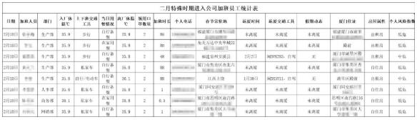 特殊时期,进入公司加班员工都需要提前一天报备和审核,并根据疫情防控风险指数将人员分为三个级别:如低危人员、中危人员、高危人员;低危是指假期没有离开过厦门,中危是指省内假期有乘坐火车/飞机/汽车等离开过厦门提早回来,高危是指外省人员有回老家过的。