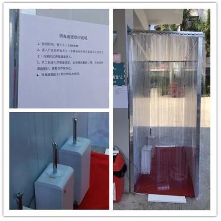 搭建专门的喷雾消毒通道,为了员工健康,选用绿色环保型六亚甲基胍杀菌消毒剂。