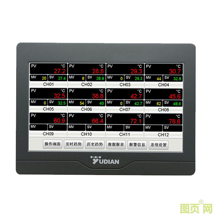 ● 显示画面有仪表屏、光柱图、实时曲线、历史曲线、数据报表、报警报表等。全中文触摸式操作,功能全面并且使用方便。
